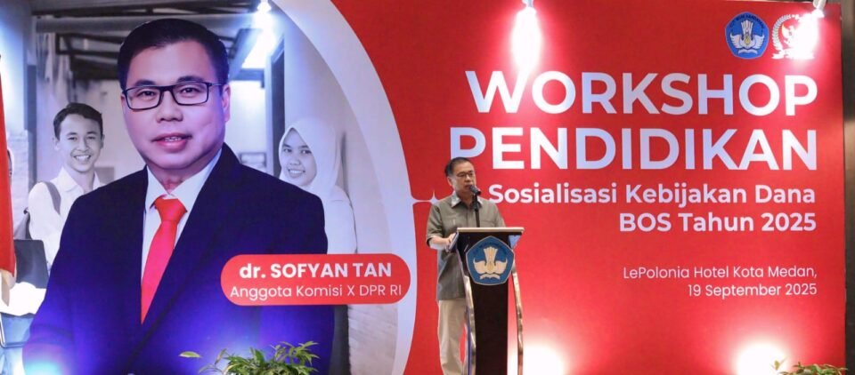 “Permen-nya sudah direvisi kan? Sebelumnya 15 persen, sekarang sudah 40 persen dari total dana BOS. Itu bukan gaji ya, tapi honor untuk menambah kesejahteraan guru,” ungkap Sofyan Tan saat menjadi keynote speaker di acara Workshop Pendidikan Sosialisasi Kebijakan Dana BOS tahun 2025 yang digelar Kementerian Pendidikan Dasar dan Menegah (Kemendikdasmen) bekerjasama Komisi X DPR RI di Le Polonia Hotel, Jl Jend Sudirman, Medan, Jumat 19 September 2025.