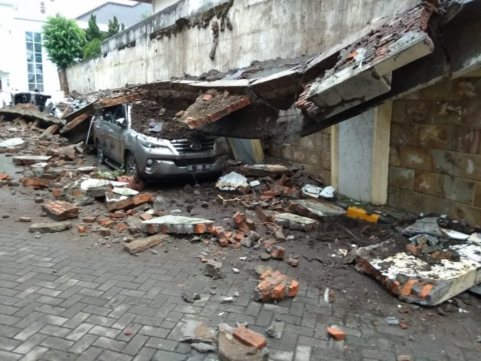 Alhasil lima unit mobil yang terparkir disisi tembok dinding, ringsek tertimpa puing bangunan.