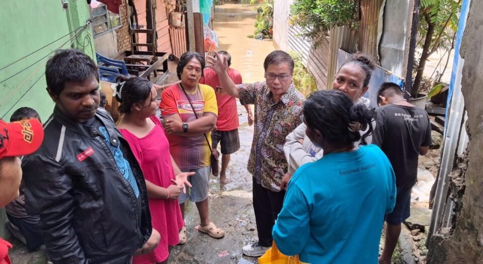 PROSUMUT – Anggota Komisi X DPR RI dari Fraksi PDI Perjuangan, dr Sofyan Tan memberikan bantuan dan motivasi ketika mengunjungi korban banjir di Lingkungan V, Kelurahan Polonia, Kecamatan Medan Polonia, akibat meluapnya Sungai Babura, Minggu siang 12 Oktober 2025.
