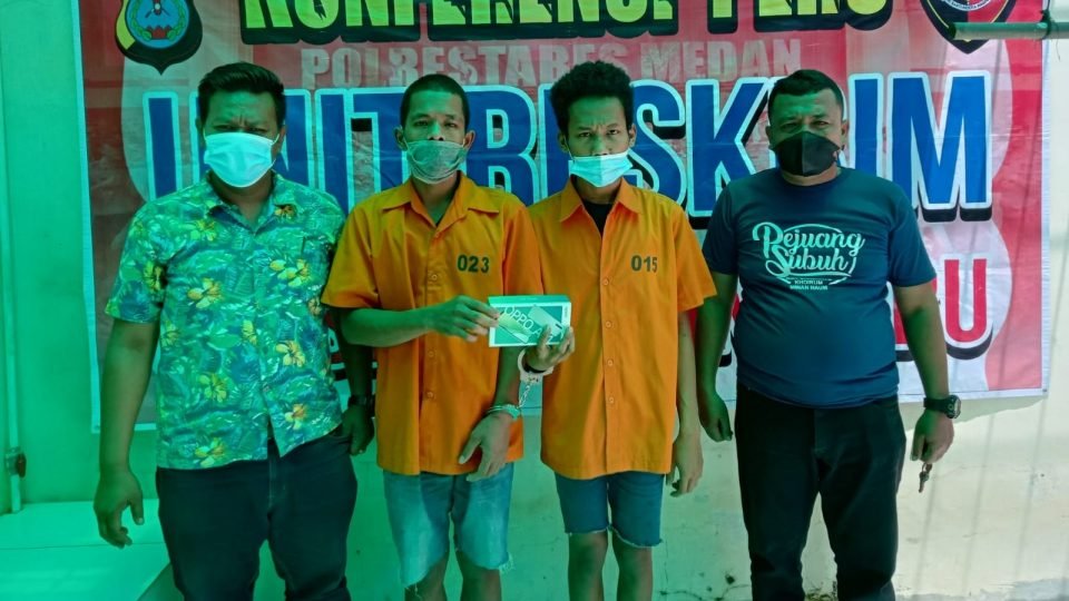 PROSUMUT – Dua pelaku penjambret dompet milik salah seorang mahasiswi saat mengendarai sepeda motor di Jalan Karya Bakti depan Gang Buntu, Kecamatan Medan Polonia, dibekuk petugas Polsek Medan Baru.