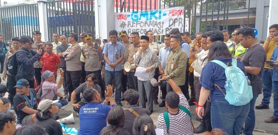 PROSUMUT – Puluhan mahasiswa yang tergabung dalam Gerakan Mahasiswa Kristen Indonesia (GMKI) Kota Medan melakukan aksi demonstrasi di depan Gedung DPRD Kota Medan, Jalan Kapten Maulana Lubis, Selasa 2 September 2025 siang.