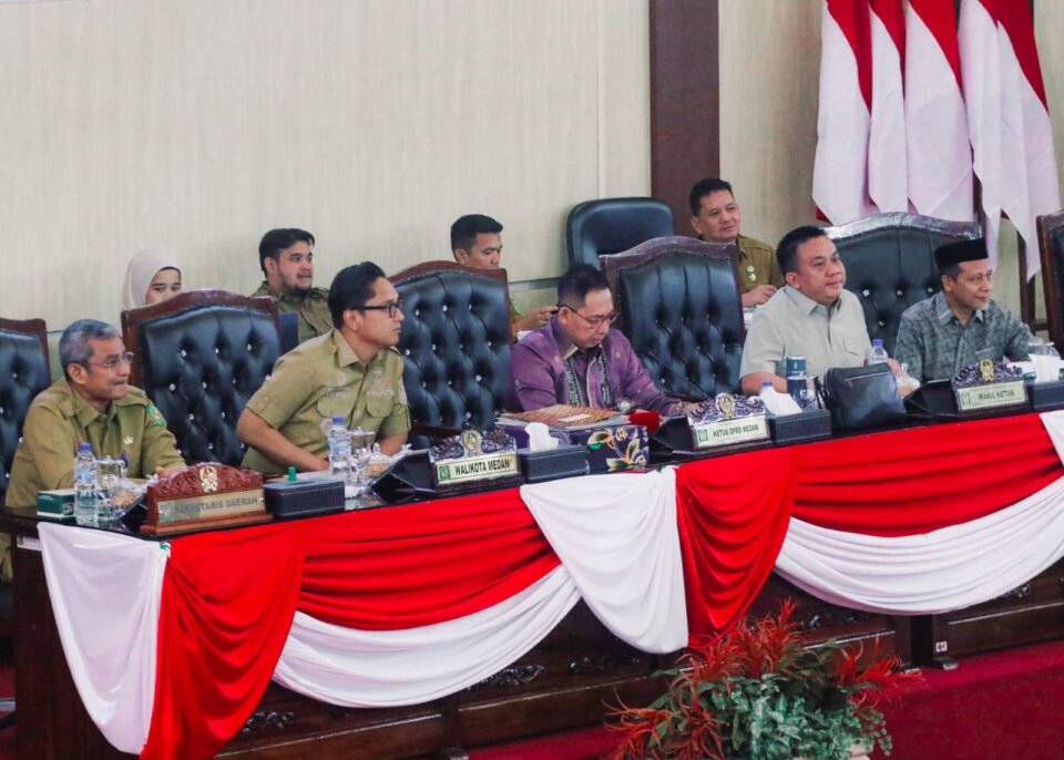 PROSUMUT — Posisi duduk Sekretaris Daerah (Sekda) Wiriya Alrahman, yang tampak ‘menempel’ di samping Wali Kota Medan, Rico Tri Putra Bayu Waas dalam rapat paripurna DPRD Medan, menuai kritik tajam.