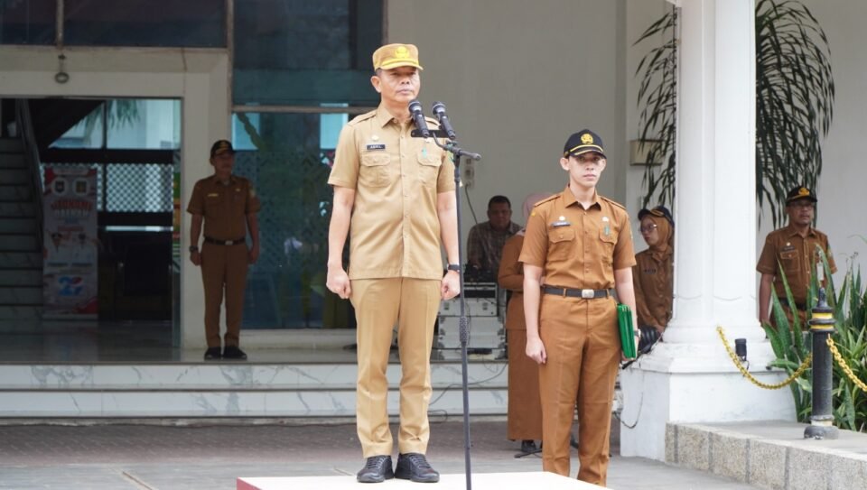 Sekda Langkat, Amril Nasution, saat memimpin apel gabungan di halaman kantor bupati.
