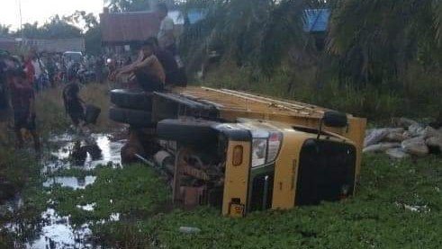 “Saat itu kondisinya hujan. roda belakang sebelah kiri oleng, dan truk keluar dari badan jalan lalu tercebur ke parit,” ungkap seorang warga di lokasi kejadian.